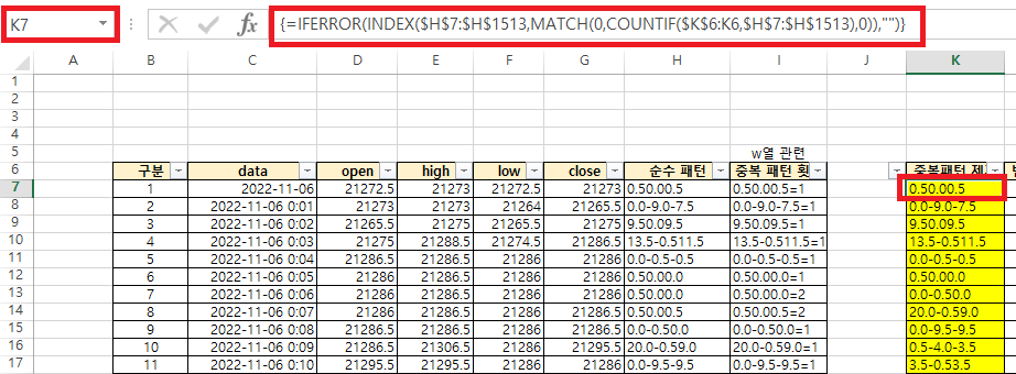 아래 파일에서 K열(중복패턴 제거) 부분을 설명할 것이다.