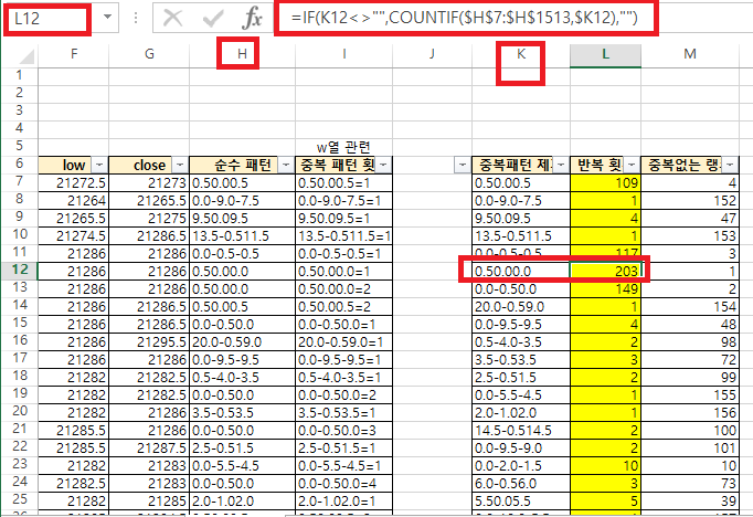 → L열(빈도수)에서 K열(패턴)의 빈도를 카운팅한다.