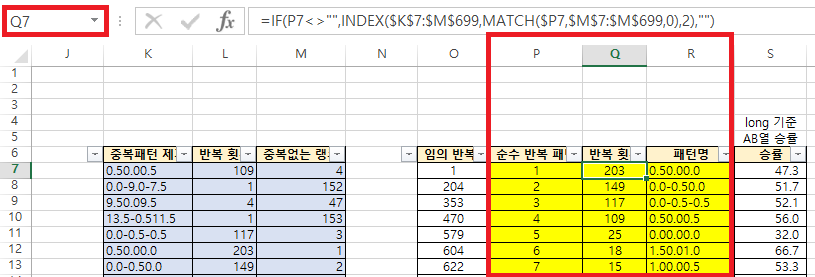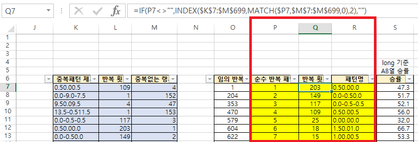 지난 글에서 패턴의 반복횟수를 확인하였다. → 빈도순(L열)