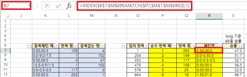 함수의 형태는 INDEX($K$7 : $M$699, MATCH($P7, $M$7 : $M$699, 0),2) 이다.