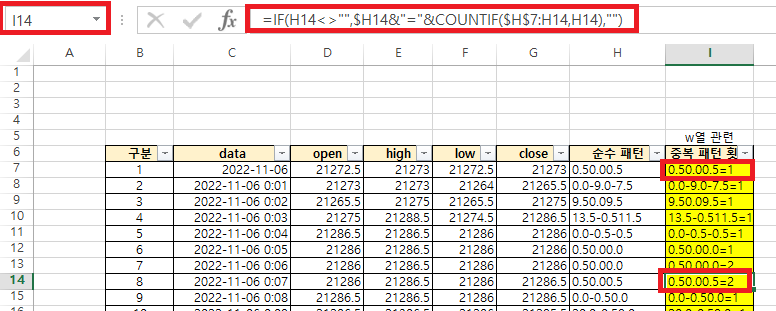함수형태는 H14 & "=" & COUNTIF($H$7 : H14, H14) 이다.