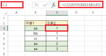 - 함수형태 : COUNTIF ($B$3 : $B3, B3)
