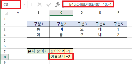 C8 셀에 4열의 문자(여름오네)를 붙여보자.