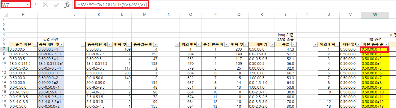 w열은 多빈도 패턴(0.50.00.0)을 Q7 셀(203번)에 대해 출력결과 뒤에