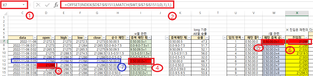 ⑤패턴(W7) : V열의 중복패턴에 고유번호를 부여한다.