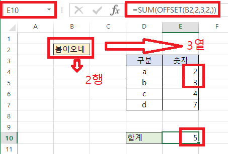 E10셀은 SUM(OFFSET(B2, 2, 3, 2, )) 로 나타낸다.