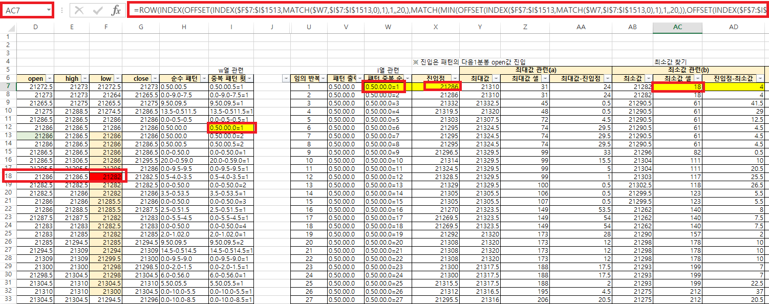함수 형태 : ROW(INDEX(OFFSET(INDEX($F$7:$I$1513,MATCH($W7,$I$7:$I$1513,0),1),1,,20,),