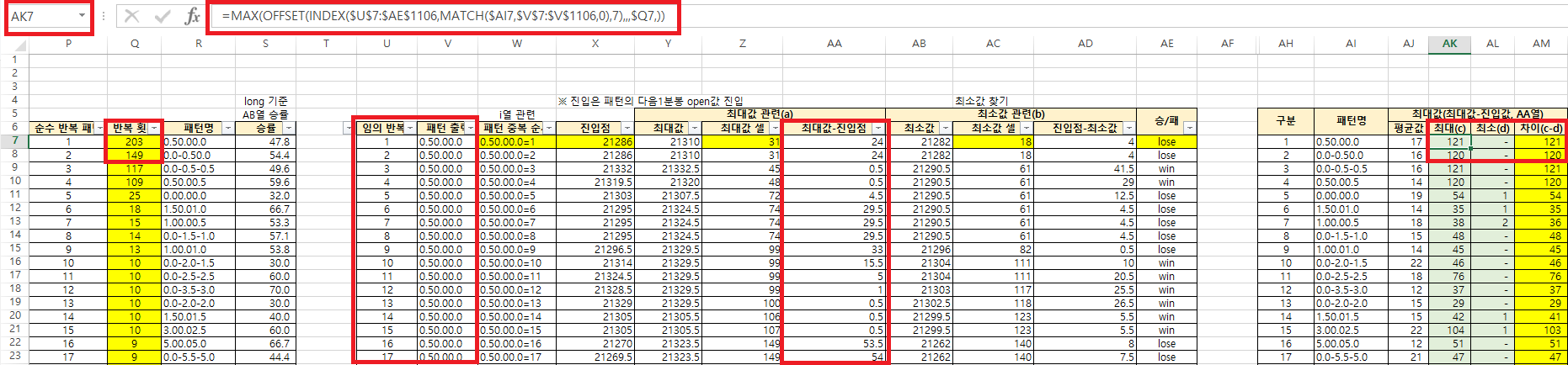 중복 패턴도 AA열(패턴별 최대값 - 진입점)을 통해 수익을 알아보았다.