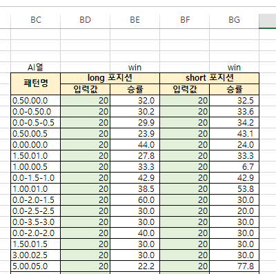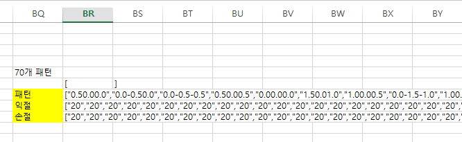 엑셀의 BQ열 이후로 만들어진 패턴, 익절, 손절을 리스트化 시킨 화면을 볼 수 있다.