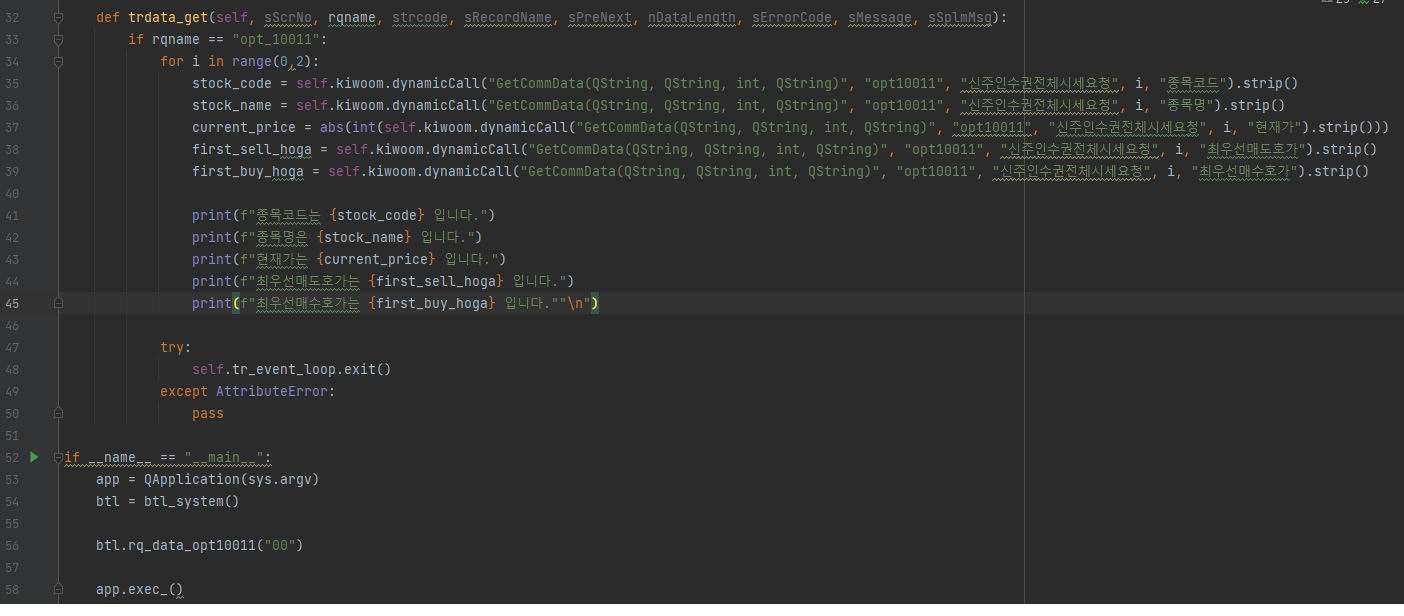 56줄 : 25줄의 함수(rq_data_opt10011)를 실행한다.