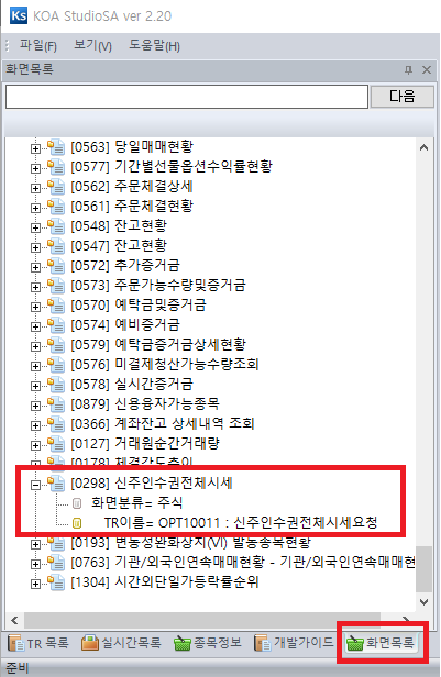 (경로) 화면목록 > [0298] 신주인수권시세 < TR이름=OPT10011 : 신주인시권전체시세요청