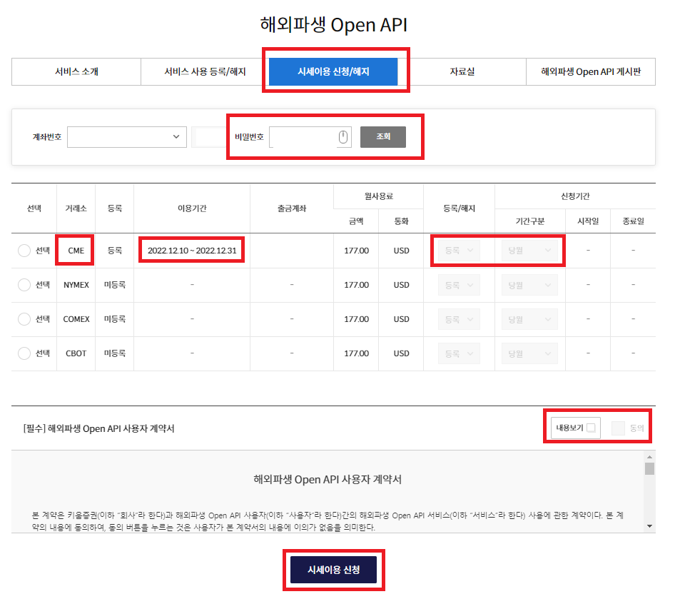 3) 등록/해지를 선택하고, 사용계약서 내용확인 후 시세요청을 신청한다.
