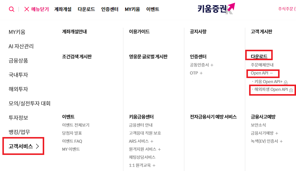- 키움증권 홈페이지 > 전체메뉴 > 고객서비스 > 다운로드 > OpenAPI > 해외파생 OpenAPI > 시세이용 신청/해지