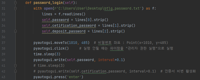 37줄~40줄 : pyautogui를 통해 "비밀번호 칸"으로 이동하여 비밀번호(33줄)를 입력한 후,