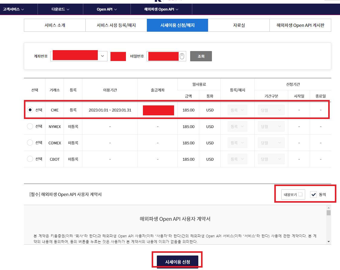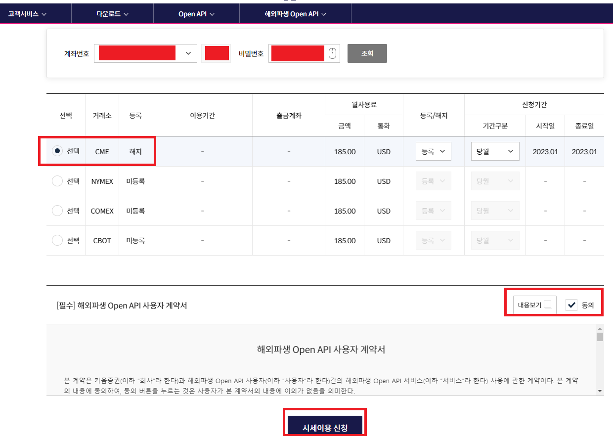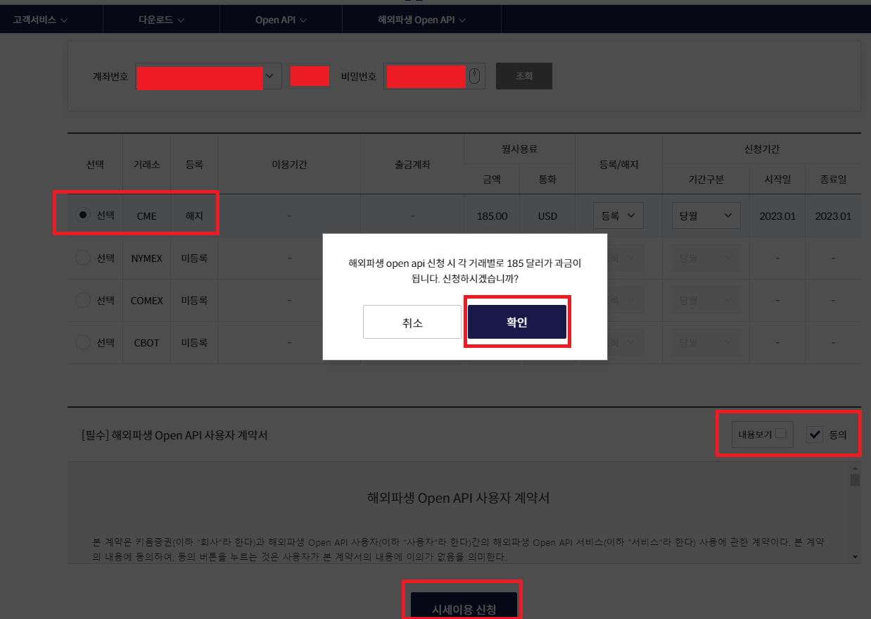 해외파생 OpenAPI 사용자 계약서의 "내용보기"를 클릭해서 확인하면,