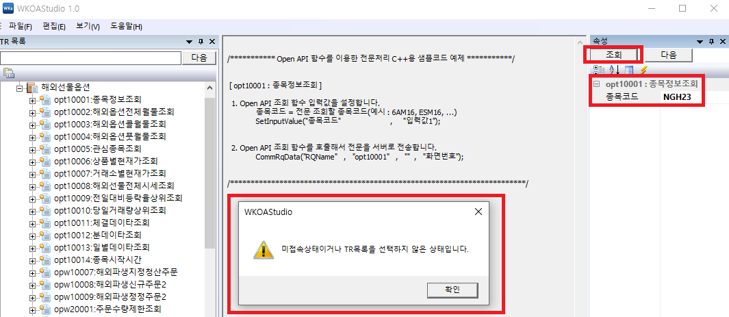 < 그림1 > 과 같이 "미접속 상태이거나 TR목록을 선택하지 않은 상태입니다.
