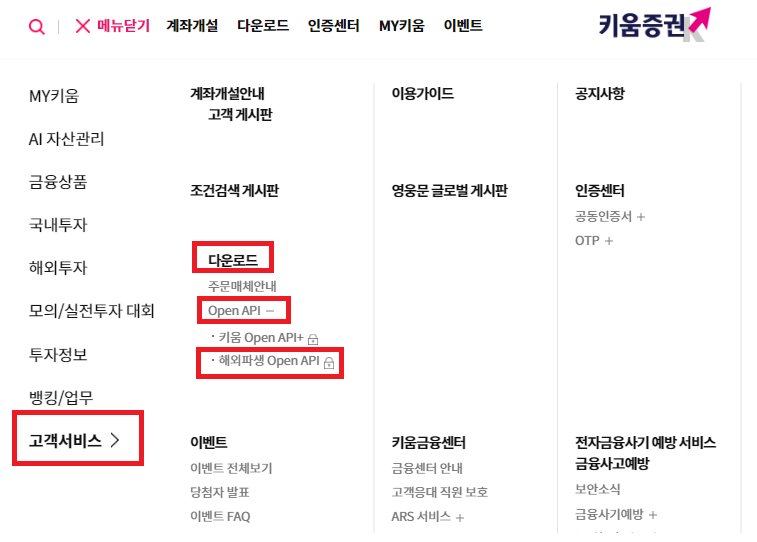 - 경로 : 전체메뉴 > 고객서비스 > 다운로드 > OpenAPI > 해외파생 OpenAPI