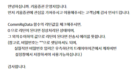 아래 < 그림 5-3 >은 CommRqData 함수의 반환값에 대한 키움측의 답변이다.