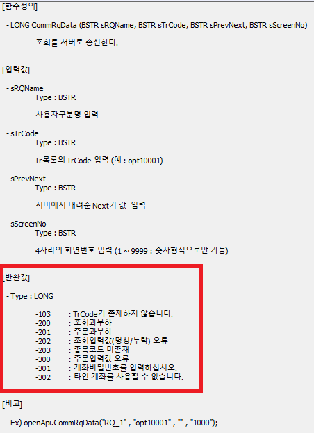 - TR요청 4단계 : SetInputValue(입력) → CommRqData(요청) → OnReceiveTrData(연결) → GetCommData(수신)