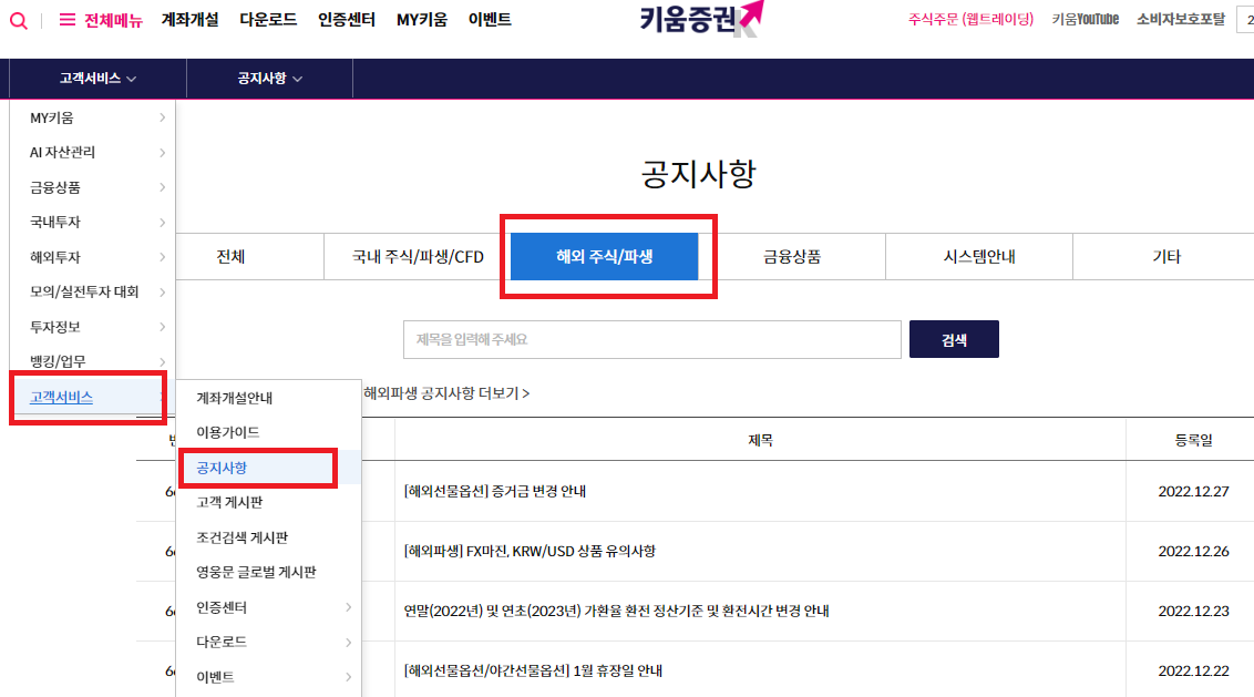 키움증권 홈페이지 > 고객서비스 > 공지사항 > 해외주식/파생 경로에서 증거금 변경을 확인하는 습관을 들이자.