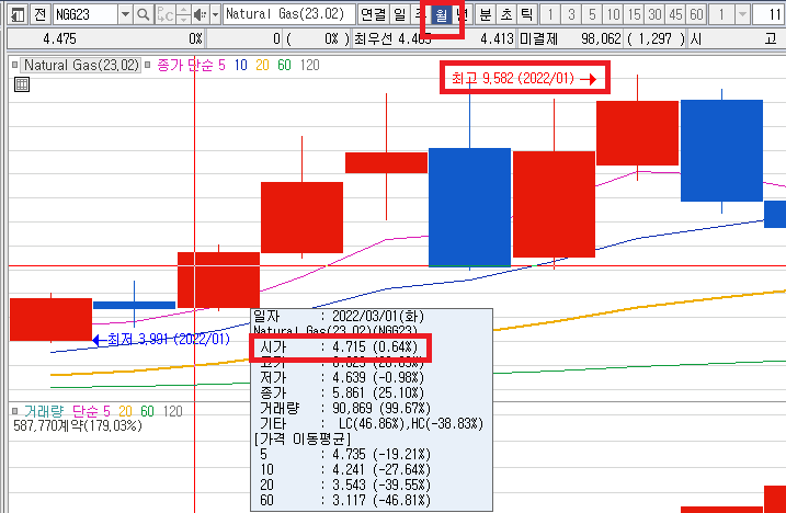 < 그림5 >처럼 천연가스는 22년 3월 시가(4.715달러)가 8월 고가(9.582달러)로 2배 상승한 것이다.