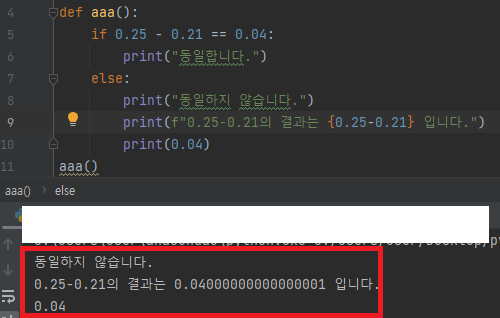 0.25 - 0.21 = 0.04000000000000001 로 나타나기 때문에 0.04와 동일하지 않다는 것을 확인할 수 있다.
