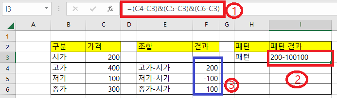 ②번(i3셀)의 패턴(200-100100)은 ①번의 결과이다. → i3셀에 입력된 내용은 왼쪽 정렬로 문자형이다.