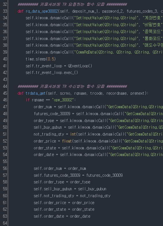 33줄~42줄 : 키움서버에 데이터를 입력(SetInputValue 함수) 및 데이터를 요청(CommRqData 함수)한다.