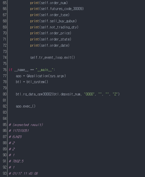 46줄 : 39줄에서 키움서버에 요청한 데이터는 13줄의 OnReceive를 통해 46줄 if rqname == 'opw30002'에 해당하면,