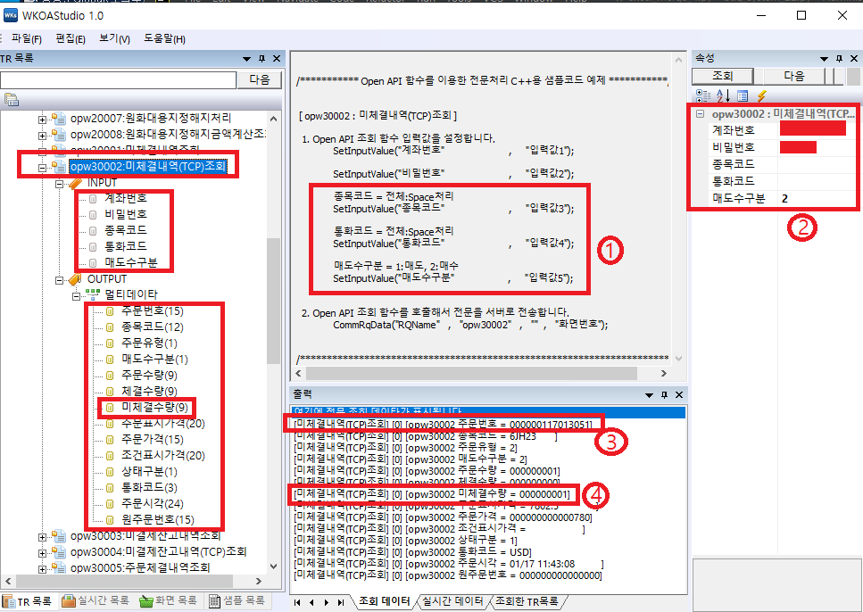 - WKOA Studio 기준, TR요청번호는 opw30002(미체결내역 조회)에서 확인할 수 있다. (그림3)
