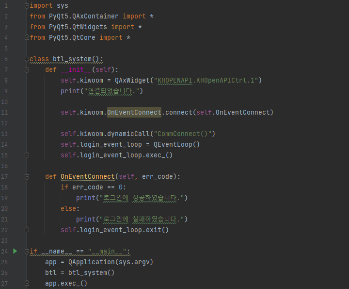 - 17줄 : 로그인을 위해 정의한 OnEventConnect 함수 (11줄과 연결)