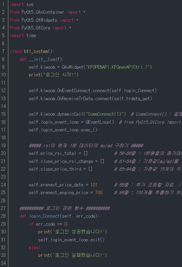 55줄 : 36줄의 함수를 실행하면, 키움증권 내 이벤트가 발생하는데 13줄의 "연결"을 통해 종가 600개를 제공받는다.