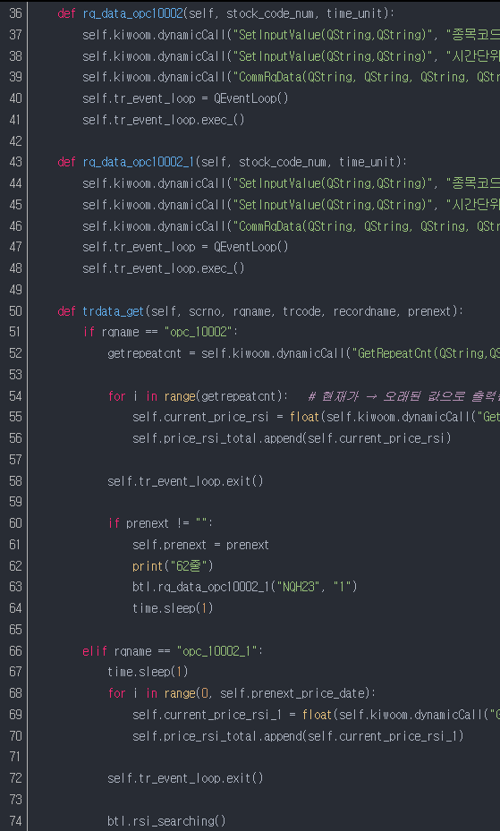 36줄~41줄 : RSI 기준값(산술평균)을 구하기 위해 키움증권 서버에 종목코드와 시간단위를 입력/요청한다.