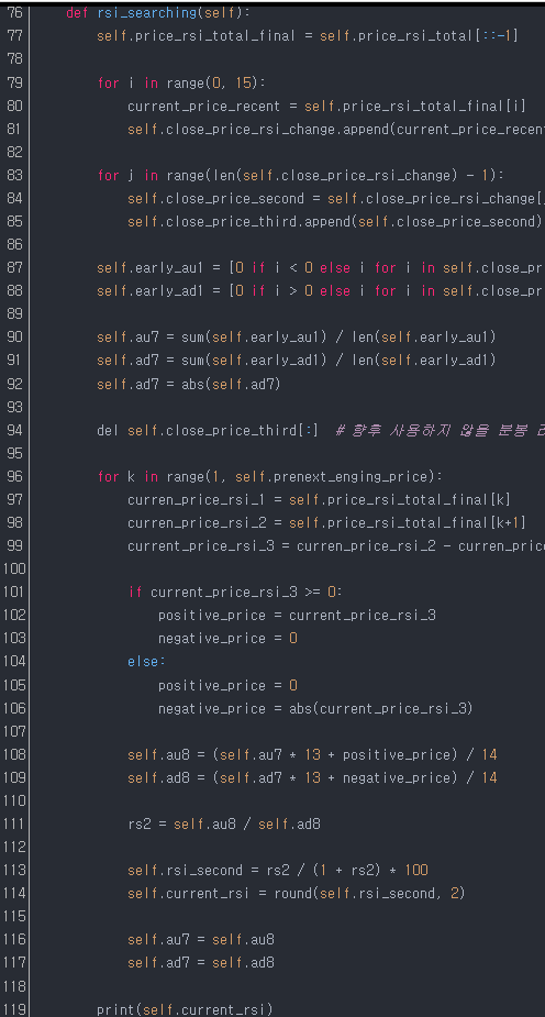 74줄 : 이 글의 핵심이다. 76줄의 rsi_searching 함수를 실행한다. 20줄의 self.price.price_rsi_total에 700개 종가 데이터를 넣었고, for문을 통해 기준값이 산출되면 첫번째 au / ad를 그 다음 au / ad에 적용하면 된다.