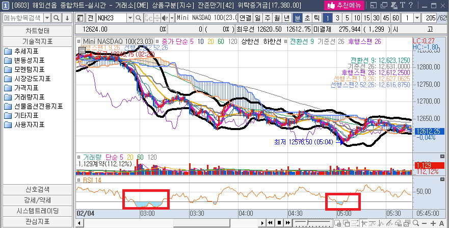 아래 < 그림 >은 나스닥(23년물, NQH23)이 3시간 정도 쭈욱 빠지는 모습이다. ('23.2.4.토. 새벽)
