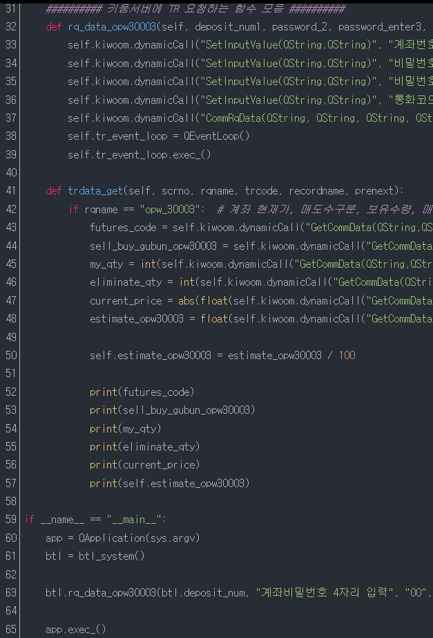 32줄~39줄 : 63줄에서 4개 인자(계좌번호, 모의 계좌비번, 입력매체, 통화코드)를 입력받는다.