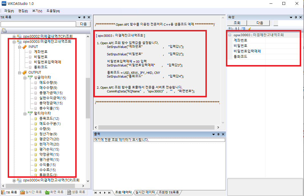 먼저 WKOA Studio에서 opw30003 TR의 내용을 확인해보자. 입력은 4가지(계좌번호, 비밀번호, 입력매체, 통화코드)이며, 6가지 데이터(종목코드, 매도수구분, 수량, 청산가능수량, 현재가격, 평가손익)를 받아올 것이다.