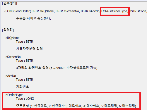 - 신규매수(2)로 sendorder 진입했다면, 청산할 때 sendorder 함수의 매도수구분은 1번(매도)으로 청산