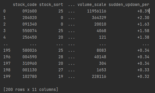 df1 = pd.DataFrame(btl.updown_stock, columns=['stock_code', 'stock_sort', 'stock_name', 'before_plus_minus', 'before_daebi_price', 'updown_per', 'standard_price', 'current_price', 'standard_daebi_price', 'volume_scale', 'sudden_updown_per'])