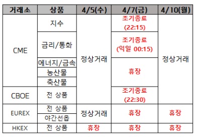 이번 주('23.4.3~4.7)에는 미국주식 휴장일(Good Friday, 4.7.금)이 있었다. 금요일 CME 선물시장의 지수(조기종료 22:15), 금리/통화(조기종료 익일 00:15) 등이 조기종료/휴장이 되었다.