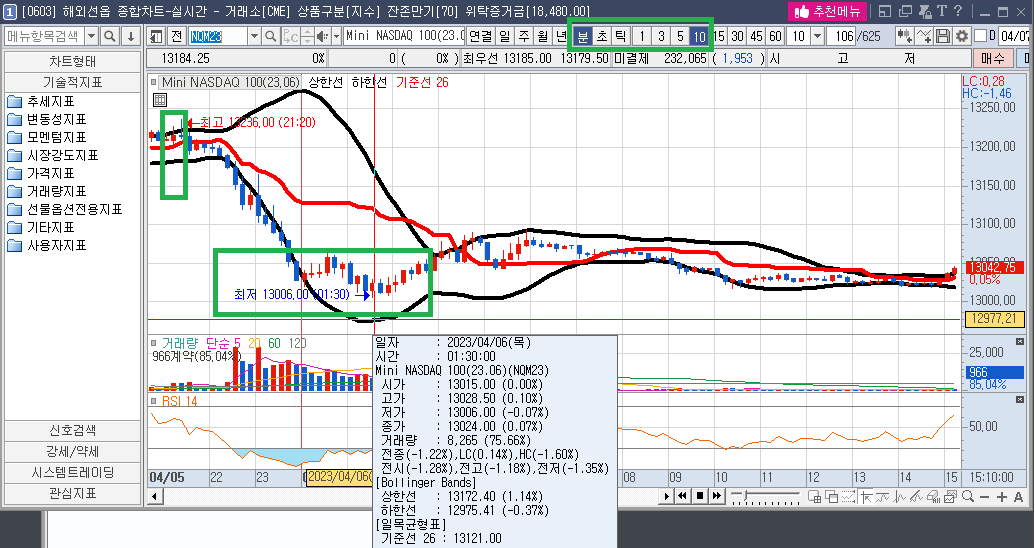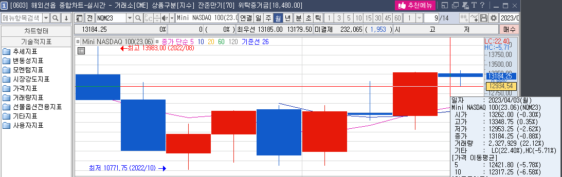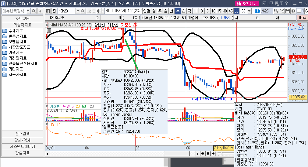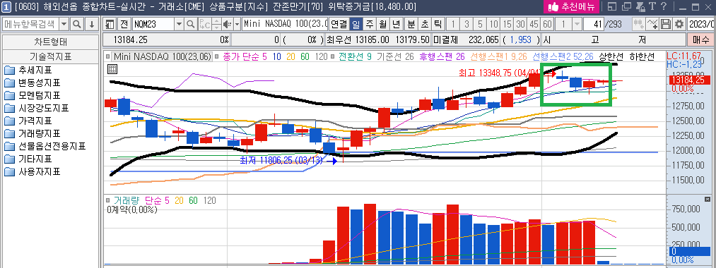 4월 4일 화요일, 고점 13348.75를 찍은 후, 수요일까지 빼고, 목요일(4.6) 올라가는 모습이다. 금요일은 제외하면, 거래량은 50만 계약 규모이다.