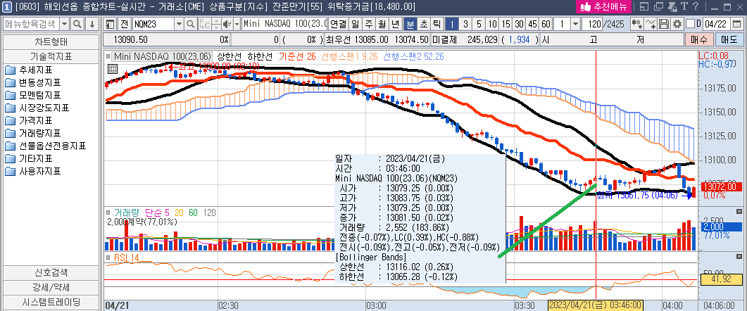 - 진입 사유 : 02:19분 13200p의 최고점을 찍은 후, 귀신처럼 계속 하방으로 떨어진다. 03:46분 떨어질 만큼 떨어졌다고 생각되어, 13083.25p로 long 1계약 진입하였다.