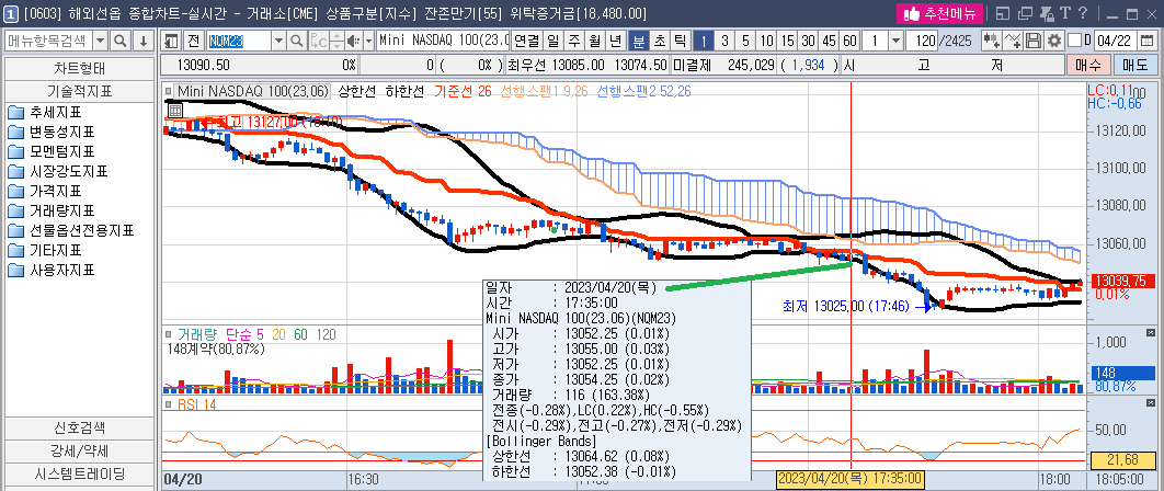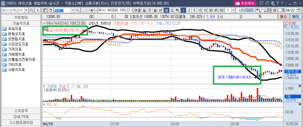 - 청산사유 : 15:05분의 13104p까지 빠지는 걸 참았고, 15:17분 13137.25p의 탈출 기회를 주었으나 홀딩하였다. 16:43에서 13060p까지 빠지는 걸 또다시 참아냈다(그림3-2). 다시 올라갈 줄 알았는데, 17:00 이후 더 빠지길래 16:43분에 못 참고 청산!