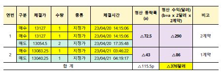 | (해선 일일 매매일지) 나스닥 매매 (2023-04-24, 월) (△212.5달러) (0) | 2023.04.26 |