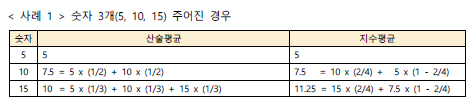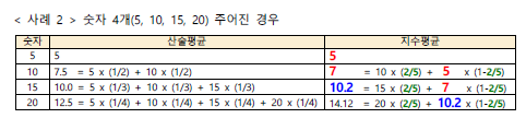 < 사례1 >에서는 3, 4, 5의 산술평균 및 지수 평균을 구해보았다.