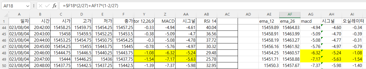 키움증권의 영웅문G에서 제공하는 MACD와 일치하기 위해 필요한 1분봉은 몇 개일까? < 그림2 >와 같이 48줄부터 일치하는 것을 알 수 있다.48줄에서 키움측에서 제공하는 MACD는 Z열에서 -6.32로 확인가능하며, 필자가 계산한 MACD값도 -6.32로 일치하는 것을 알 수 있다.