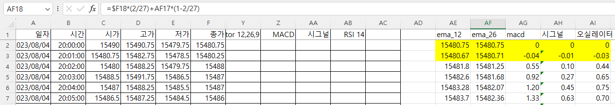 이번 글에서는 엑셀을 통해 MACD 구하는 방법을 알아볼 것이다. 선물지표를 파이썬으로 구현하기 위해서는 엑셀에 구현을 하곤 한다. 이유는 엑셀 함수를 만들어가면서 코딩을 어떻게 작성해야 하는지 머릿 속에서 그려보기 위해서이다.