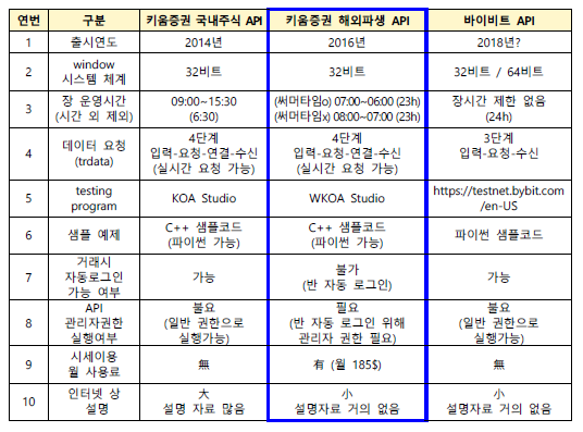 목 차 1. 들어가며 2. API 비교 1) 출시연도 2) 운영체제는 32비트 3) 장 운영 시간 4) 데이터 요청방법 5) 테스팅 프로그램 6) 샘플예제 7) 거래시 자동로그인 실행여부 8) API 관리자 권한 실행여부 9) 시