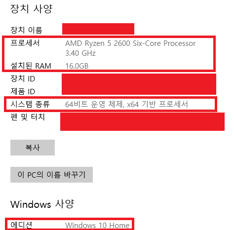 (경로) 윈도우 바탕화면 > 내 PC > 속성 경로에서 확인한 결과이다.