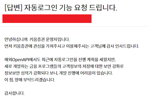 키움증권에서는 "자동로그인" 요청에 대해 보안 상의 이유로 "곤란"하다는 입장이다. 아이디/비번, 계좌/비번을 일일히 입력해주어야 하는 불편함이 있지만, 자동로그인이 불가하다는 현실은 받아들여야 할 거 같다.